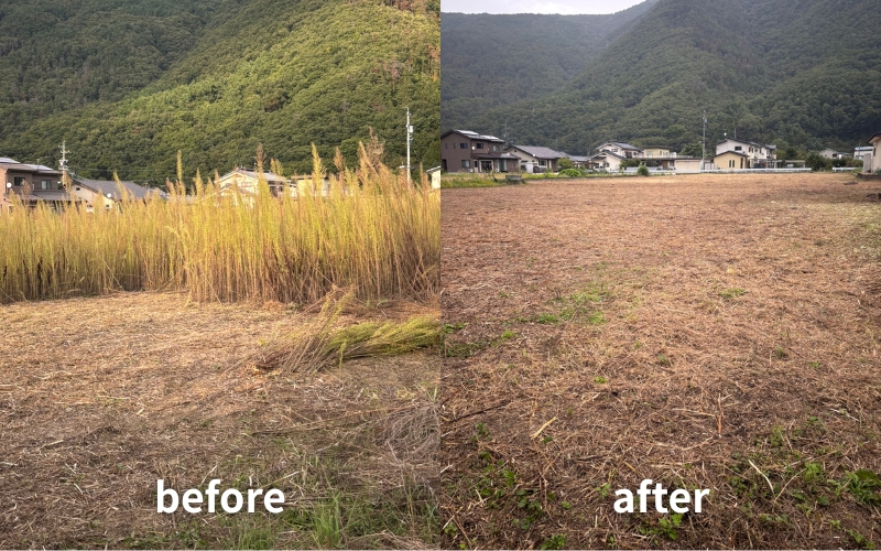 - 作業内容:背丈以上の雑草刈り取り、地面近くまで丁寧な除草